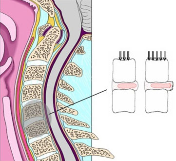 정 상적으로 목에도 허리와 같이 등뼈(척추)와 등뼈사이에 충격완화장치가 되는 디스크가 있는데 이 디스크가 어떠한 원인에 의하여 신경이 지나가는 길(척수강)로 삐져나오게 되면 척수강에 있는 신경과 척수가 눌리게 되고 눌리는 신경에 따라 통증, 감각이상, 근력마비와 눌리는 척수이하로 감각이상, 근력마비, 대소변의 장애, 근의 강직 등의 증상을 나타내는 병을 말합니다.