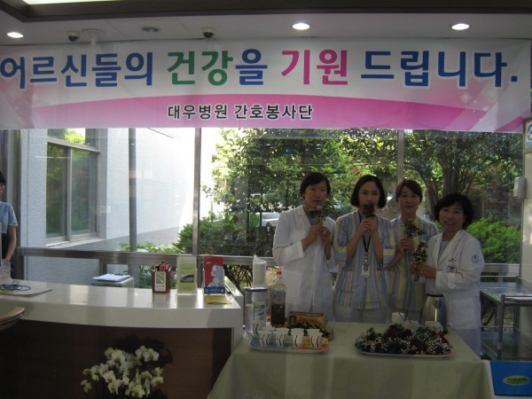 5월 8일 어버이 날을 맞이하여 대우병원 간호봉사단에서 카네이션 250 송이를 자체 제작하여 파랑포 안나의 집에 주거하시는 어르신 20여명과 병동 입원환자, 외래 방문 환자중 60세 이상의 어르신들께 카네이션을 달아 드리는 행사를 하였다.