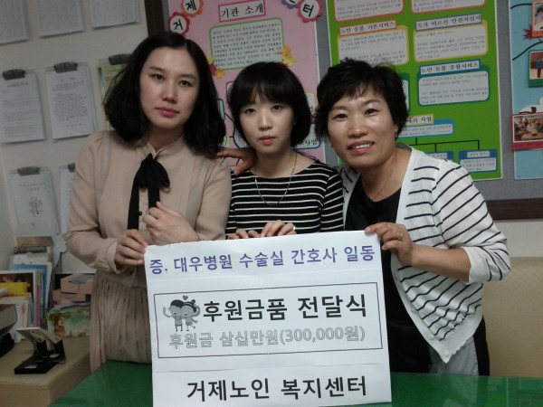 첨부파일 - 첨부파일: 11.jpg (1.3M) 101 2015-06-26 13:35:02 이전글다음글 목록 본문 2012년 9월 24일 거제시 노인복지센터를 방문하여 후원금을 전달하고 왔습니다^^ 노인복지 센터에서 주최하는 '독거노인 추석 한상차리기' 에 동참하여 그동안 수술실 자체에서 조금씩 모아둔 후원금을 전달 하였습니다.