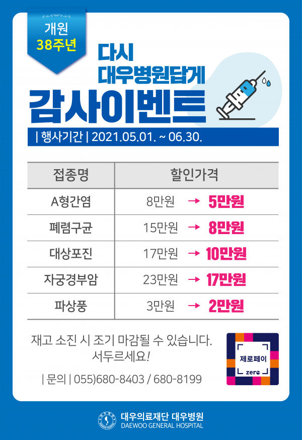 예방접종 할인 이벤트(2021.06.30까지) 페이지 정보 건강증진센터 작성일21-05-10 09:45 조회5,904회 댓글0건 본문 예방접종 할인이벤트 2021.6.30까지~ 서두르세요~ 이전글 다음글 목록