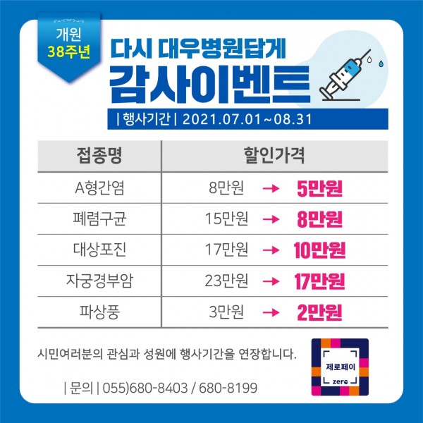 예방접종 할인 이벤트 연장(8.31까지) 페이지 정보 건강증진센터 작성일21-07-13 10:10 조회5,325회 댓글0건 본문 여러분의 성원에 힘입어 대우병원이 예방접종 할인 이벤트를 연장합니다~ 내용을 참고하시기 바랍니다. 이전글 다음글 목록