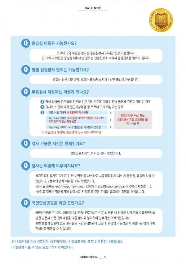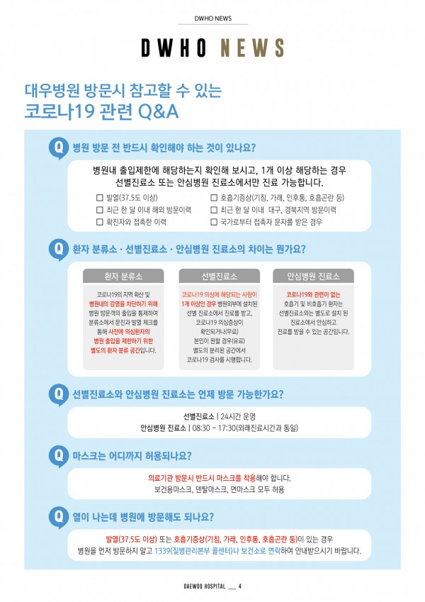 코로나19(COVID-19) 관련 병원방문 어떻게 하나요? 페이지 정보 건강증진센터 작성일20-03-16 15:30 조회10,484회 댓글0건 본문 코로나19(COVID-19) 바이러스와 관련해 대우병원 방문시 참고하시기 바랍니다. 이전글 다음글 목록