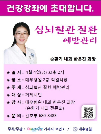 [강좌] 거제시민 대상 - 심뇌혈관질환예방관리 페이지 정보 대우병원 작성일14-03-27 15:50 조회76,576회 댓글0건 본문 [강좌] 거제시민 대상 - 심뇌혈관질환예방관리 이전글 다음글 목록