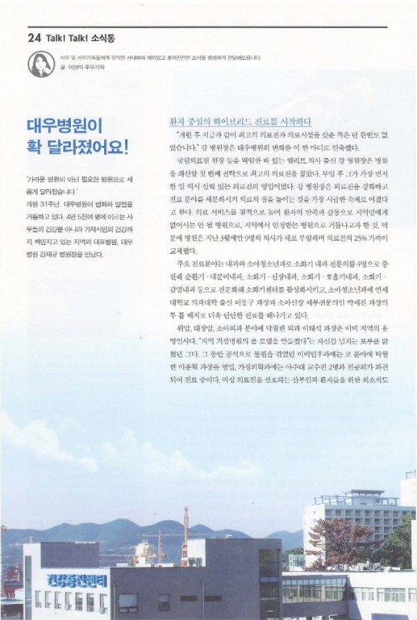 [기사] 대우조선해양 사보 "해오름터플러스" -병원장 인터뷰 페이지 정보 대우병원 작성일14-05-08 09:52 조회75,466회 댓글0건 본문 [기사] 대우조선해양 사보 "해오름터플러스" -병원장 인터뷰 이전글 다음글 목록