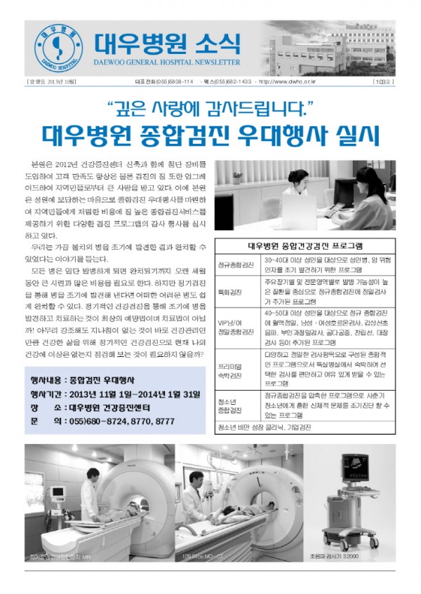 [소식]대우병원 종합검진 우대행사 실시 페이지 정보 대우병원 작성일13-10-24 23:23 조회78,615회 댓글0건 본문 지역민의 깊은 사랑에 진심으로 감사드립니다. 이전글 다음글 목록