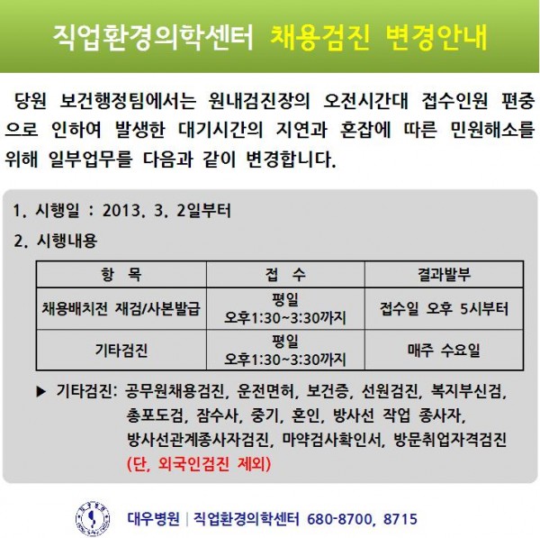 [안내] 직업환경의학센터 채용검진 변경안내 페이지 정보 대우병원 작성일13-03-12 23:23 조회98,281회 댓글0건 본문 [안내] 직업환경의학센터 채용검진 변경안내 이전글 다음글 목록