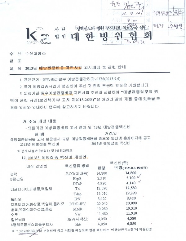 [안내] 2013년 예방접종비용 지원사업 고시 개정 변경 알림 페이지 정보 대우병원 작성일13-09-17 05:09 조회98,979회 댓글0건 본문 2013년 예방접종비용 지원사업 고시 개정 변경을 붙임과 같이 알려 드립니다. 이전글 다음글 목록