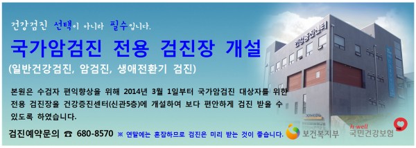 [안내] 국가암검진 전용 검진장 개설 페이지 정보 대우병원 작성일14-03-13 10:37 조회99,969회 댓글0건 본문 본원은 수검자 편익향상을 위해 2014년 3월 1일부터 국가암검진 대상자를 위한 전용 검진장을 건강증진센터(신관5층)에 개설하여 보다 편안하게 검진 받을 수있도록 하였습니다. 이전글 다음글 목록